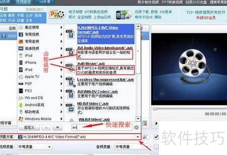 1、 选择输出格式为AVI。点击预设方案后的下拉箭头,可通过快速搜索输入avi查找对应格式。软件内提供多种AVI选项,容易令人犹豫不决。建议逐一查看各格式下方的详细描述,根据实际需求挑选最合适的AVI类型即可完成设置,操作简便直观,确保转换结果符合预期使用要求。