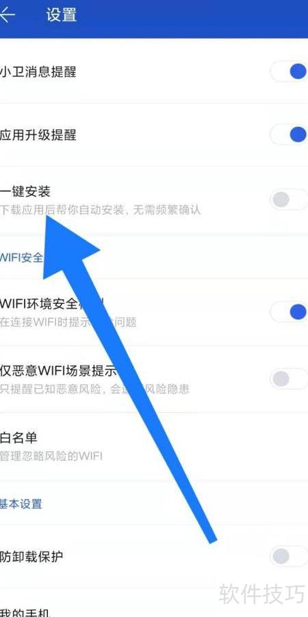 3、 在设置中开启一键安装功能,下载应用后可自动完成安装,省去反复确认的麻烦,用户可根据实际需求自行选择是否启用。