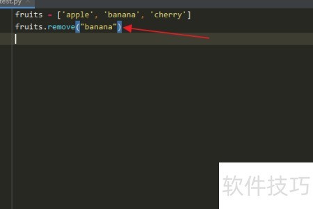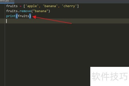 7、 在运行结果窗口中,fruits 列表中的 banana 元素已被 Python 的 remove() 方法成功移除。