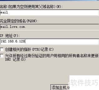 4、 为确保Exchange 2010邮件系统正常收发邮件,需在DNS服务器上进行相应配置。具体操作为:添加一条主机名为mail的A记录,完整域名设置为mail.love.com,并将其指向IP地址192.168.6.128,该地址即为邮件服务器的实际IP,从而实现域名与服务器地址的正确解析。