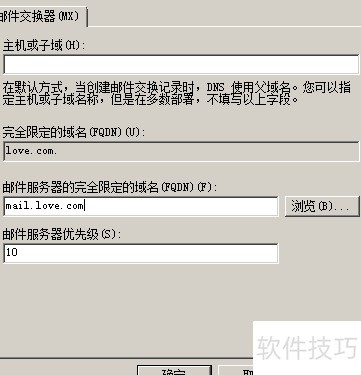 6、 将主机或子域配置项留空,仅输入邮件服务器的完整域名:mail.love.com。