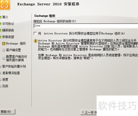 13、 可设置Exchange组织名称,通常使用公司名称,也可保持默认配置不变。