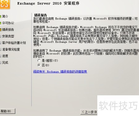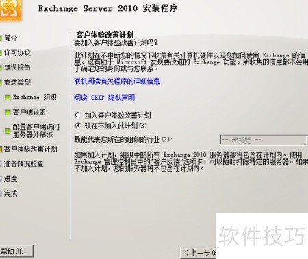 16、 设置Exchange 2010邮件系统是否参与微软客户体验改善计划。