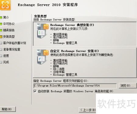 12、 选择Exchange 2010的典型安装模式,将在该服务器上部署中心传输、客户端访问和邮箱服务器角色,同时一并安装相应的管理工具,实现全面的功能集成与便捷的系统管理。