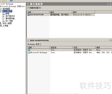 19、 打开Exchange管理控制台,进入服务器配置菜单,查看服务器角色信息,显示该服务器承担集线器传输功能,同时具备客户端访问与邮箱服务角色。