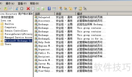 20、 打开Active Directory用户和计算机管理工具,查看是否存在用于管理Exchange组织的专用安全组,并确认是否已创建专门的组织单位(OU)来存放Exchange相关安全对象。