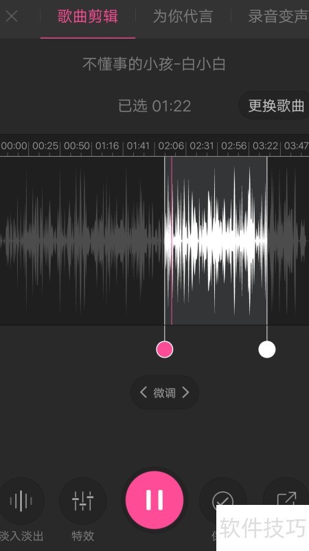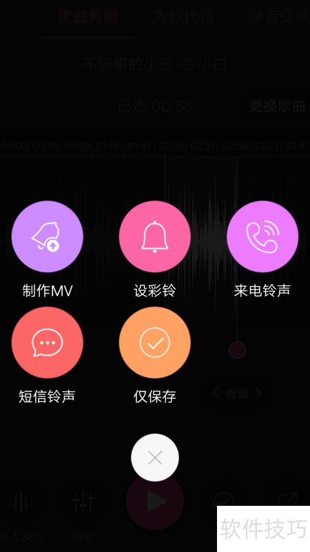 6、 选定所需片段后,点击特效设置来电铃声的淡入和淡出效果,即铃声音量由小变大再由大变小,实现自然过渡的听觉体验。