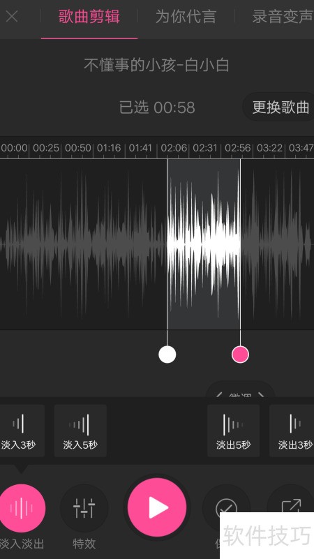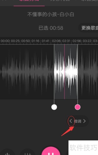 4、 在歌曲剪辑界面,通过观察音乐的波形图,可拖动两条控制线来选取所需旋律片段。波形变化清晰呈现高潮与低潮,左右调节控制线即可精准定位并裁剪目标段落。