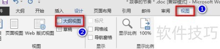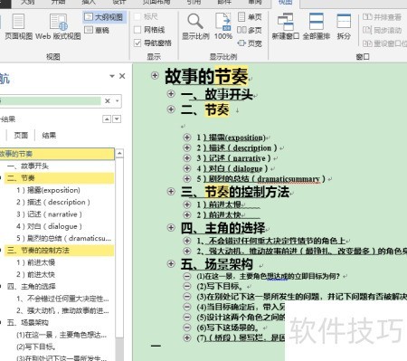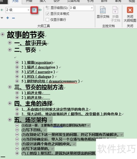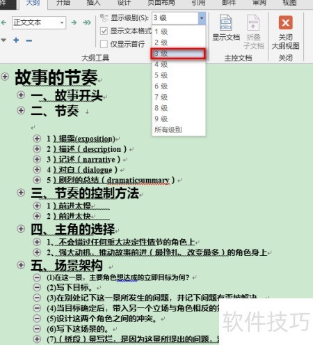 4、 首先确定树形视图的最高层级。在示例中,将鼠标移至故事的节奏标题任意位置并单击,随后在大纲菜单的下拉选项中选择1级即可完成设置。