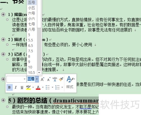 8、 若系统自动生成的字体加粗或字号大小不符合预期,可手动选中相应内容,取消加粗并调整字号。例如,剧烈的总结这一项字体偏大,可将其修改为五号字,以达到更合适的视觉效果。