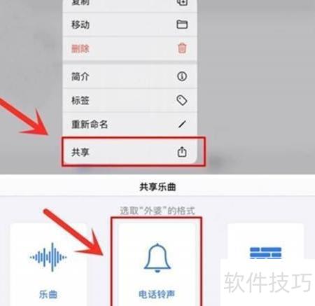 4、 将铃声导入库乐队,选择共享选项,接着点选电话铃声功能即可完成设置。