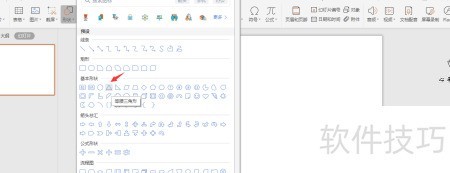 1、 进入插入选项,选择形状中的等腰三角形,并在页面上绘制出来。