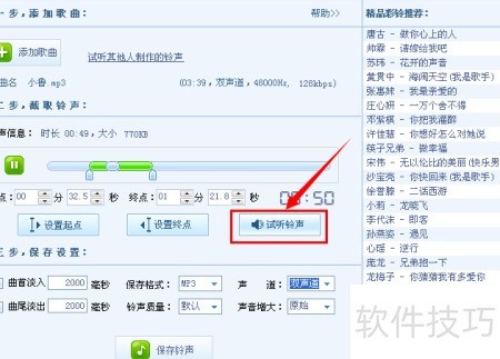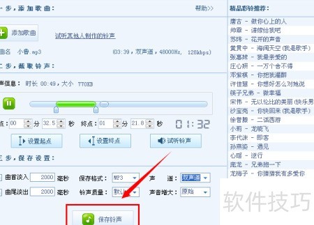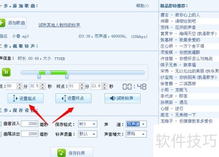 3、 选取歌曲起始与结束位置,截取40至50秒为最佳铃声长度。