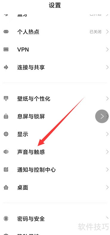 1、 进入手机设置,选择声音与触感选项