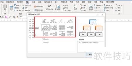 1、 打开Word文档,选择插入菜单中的SmartArt功能。