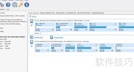 6、 安装软件后启动Macrium Reflect,程序会自动识别系统中的硬盘。选择需要备份的系统盘,界面将显示克隆此磁盘和创建此磁盘映像两个选项,分别用于磁盘克隆和生成镜像文件。在操作栏顶部,第一个功能支持用户自定义选择特定分区进行映像备份,便于灵活管理数据保护方案。