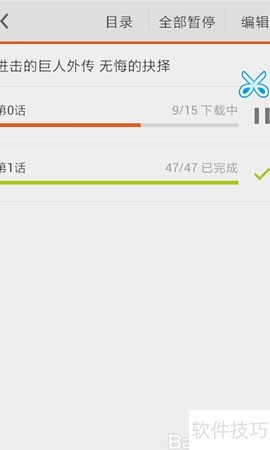 7、 当前正在下载的漫画为进击的巨人外传,点击可查看具体进度。如需暂停下载,只需轻点右侧的暂停按钮即可完成操作。