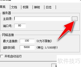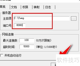 6、 将WEB主目录设置为C盘Temp文件夹,自定义端口为8080,确认后保存配置即可生效。