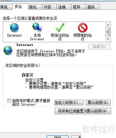 6、 进入Internet选项中的安全选项卡,取消勾选启用保护模式,保存设置后重启浏览器,重新登录农业银行网银即可正常打印单据。