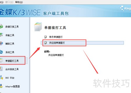 2、 进入客户端工具包,选择单据套打设置中的供应链套打并开启。