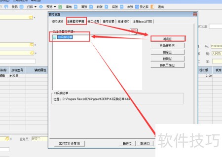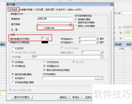10、 切换至打印选项页签,选取所需的套打文件,设定每行分录数量,取消勾选超出页边距警告,确保即使内容超出也能完整显示打印效果,最后即可运用该套打模板进行订单打印操作。