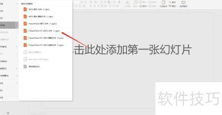 打开PPTX文件后,点击文件菜单,选择另存为,在保存类型中选取PowerPoint 97-2003演示文稿,即可将文档保存为PPT格式。