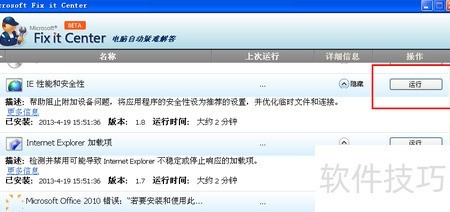 2、 在程序列表中,可找到常见软件的故障处理方法,如IE浏览器和Office软件的修复方案。以IE浏览器为例,进入相关选项后,只需点击运行按钮,系统便会自动执行修复操作,帮助解决浏览器问题,操作简单便捷,适合普通用户快速上手使用。