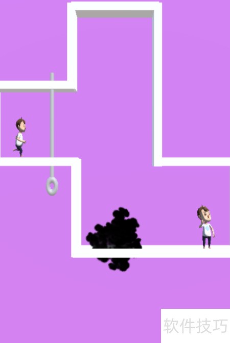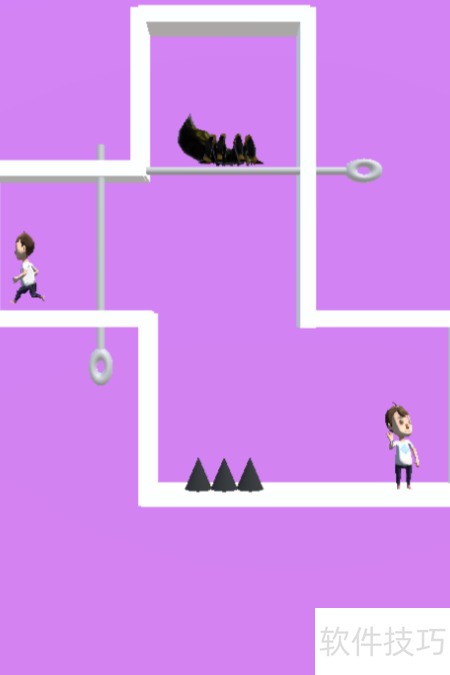 1、 关卡中有两根拉针,双胞胎兄弟分别位于左端和右下角,毒蜘蛛在上方,具体布局见示意图。