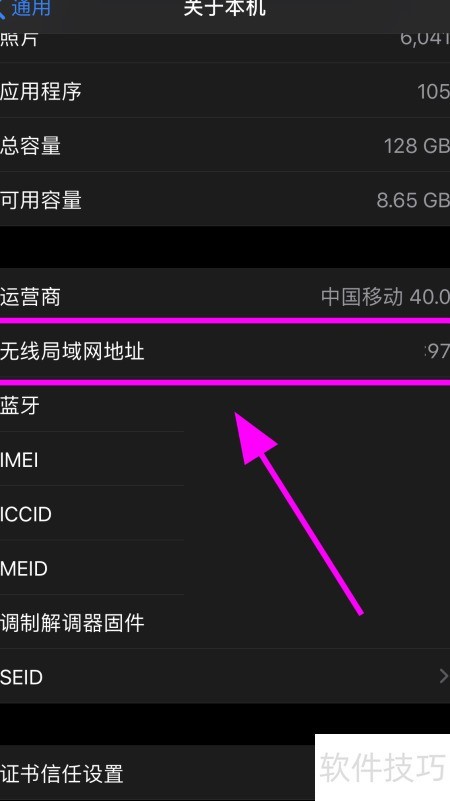 6、 上滑屏幕,无线局域网地址后的字母数字组合即为MAC地址。