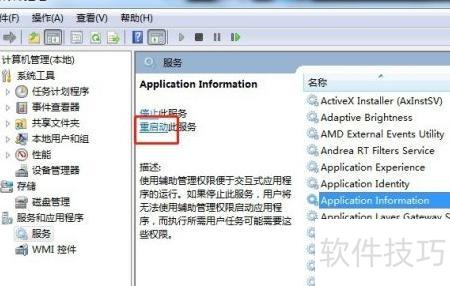 在Win7系统中,通过服务管理窗口找到Application Information,右键选择重启即可。