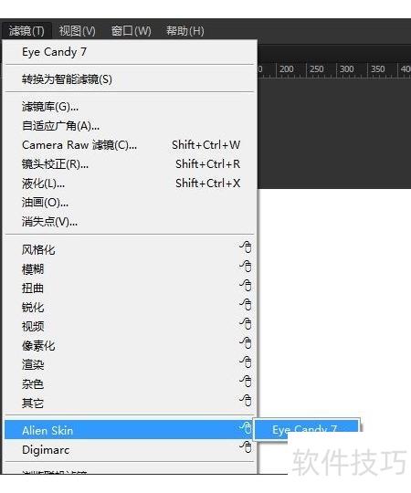 1、 新建文档后,点击滤镜菜单,选择Alien Skin中的Eye Candy 7选项,启动Alien Skin Eye Candy 7插件即可开始操作。