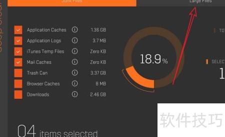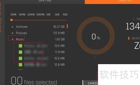 4、 若需清理大体积文件,如电影或音乐,可点击larger files选项。界面左上角会显示文件大小排序,拖动滑块设定阈值,系统将列出大于该尺寸的所有文件。随后进入具体文件夹,例如music,勾选需要删除的歌曲,确认无误后点击clean即可完成清除。请注意,此操作会永久删除所选文件,请务必谨慎执行,避免误删重要数据。