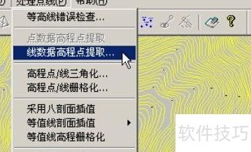 5、 点击处理点线菜单中的线数据高程点提取功能,操作所示。