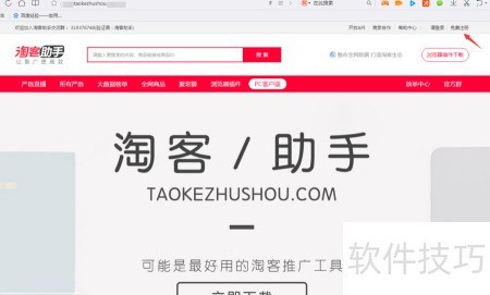 1、 访问网页并进入淘客助手首页,下载其PC客户端,随后在页面右上方完成免费账号注册。