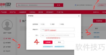 6、 点击左侧推广渠道/新建渠道,进入创建页面。将之前复制的PID填入相应位置,确认无误后提交,即可完成新渠道的创建。