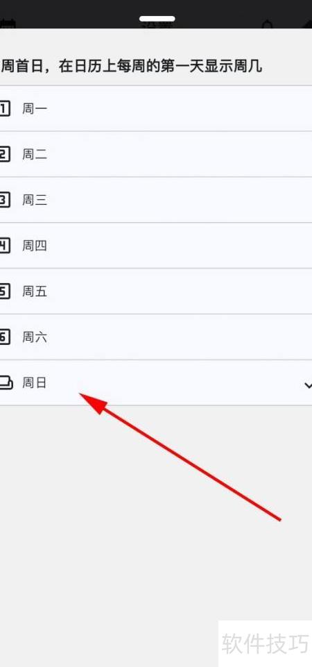 3、 最后在新页面中选择周的起始日即可完成设置。