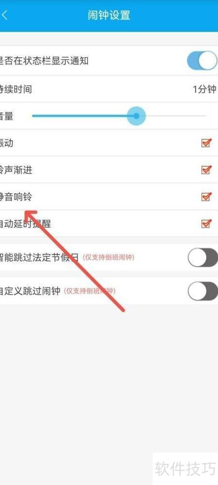3、 在闹钟设置页面勾选静音选项,即可将倒班闹钟设为静音状态。