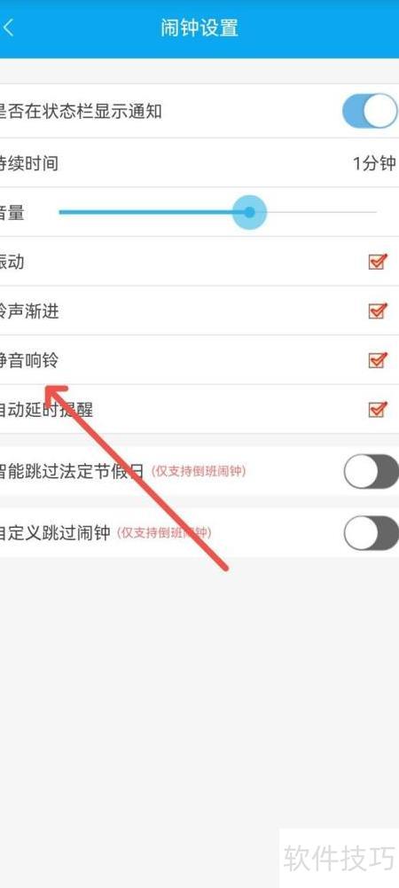 3、 在闹钟设置页面勾选静音选项,即可将倒班闹钟设为静音状态。