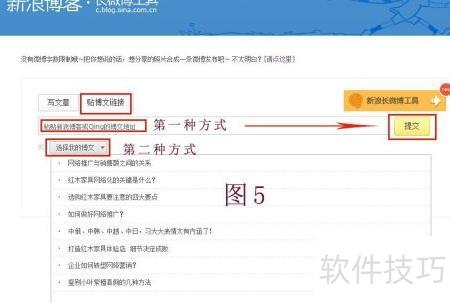 2、 进入长微博工具页面后,可通过撰写文章或粘贴博文链接两种方式发布,具体操作4所示。