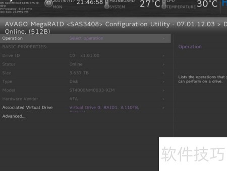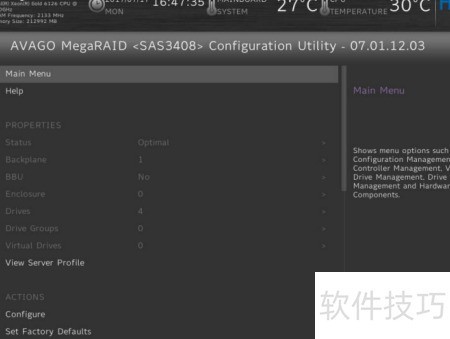 5、 选择Avago SAS3408 RAID控制卡,按下回车键,进入主界面,所示。