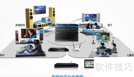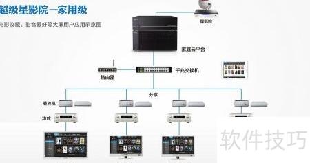 2、 家庭云平台可作为影音收藏中心,连接千兆交换机并配合百兆路由器,下接多台高清硬盘播放器,构成家庭影院系统。通过功放、音响与投影幕布实现高品质视听体验,同时支持iPad远程操控,方便管理影片资源与播放设备,打造智能化的家庭娱乐环境。