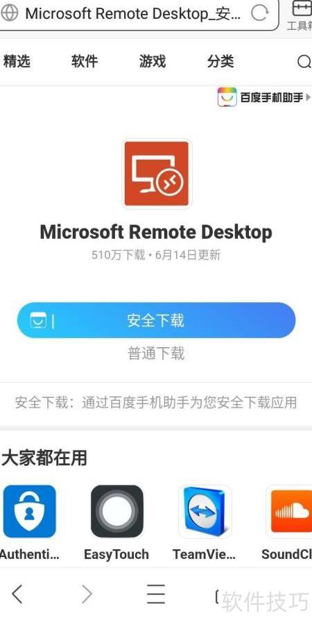 8、 在百度手机助手中搜索Microsoft Remote Desktop并下载安装该应用程序。