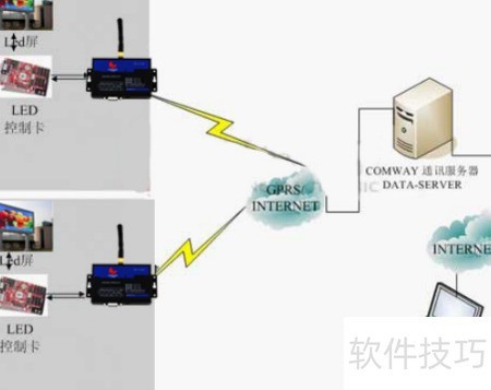 2、 利用COMWAY GPRS DTU与COMWAY通讯服务器构建远程无线LED信息发布系统,系统由前端设备和控制后台组成。前端包含LED显示屏、显示屏控制卡及CM3160型GPRS DTU,实现信息的接收与显示;控制后台由COMWAY DATA-SERVER通讯服务器及用户端LED发布软件构成,负责信息的编辑、传输与集中管理,支持远程实时更新,适用于多种户外信息发布场景。