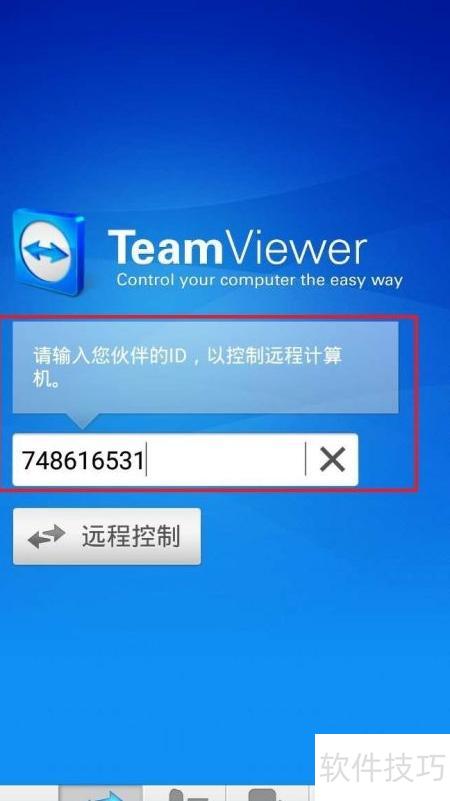 3、 打开手机TeamViewer,输入对方ID:748616531,然后点击远程控制即可开始连接。