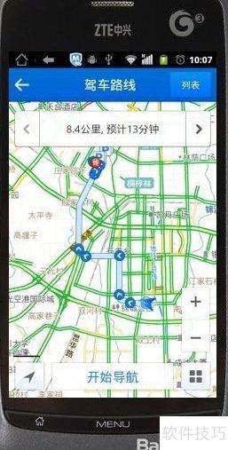 10、 确定当前位置后,在地图上选择目的地并点击,进入设置页面完成设定。随后地图会显示一条驾车路线,标注全程约8.4公里,预计行驶时间13分钟。确认无误后点击开始导航,系统将提供语音引导,实时播报行驶信息,帮助用户顺利抵达目的地,操作简便,导航精准,出行更高效。