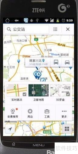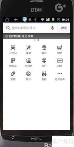 9、 旅游爱好者出行时,可点击右下角菜单,选择周边功能,即可查看附近的公交站、美食、娱乐设施、医院、加油站及酒店等实用信息,方便安排行程。