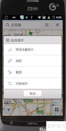 6、 点击菜单后,系统将提示选择操作。作为导航类应用,需先确认当前位置。选择选项,软件默认定位为帝都,当地用户可直接使用,无需更改。