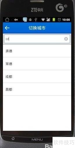 7、 点击后,在输入框中键入城市名称的首字母,例如cd搜索成都,系统将显示相关结果,从中选择即可完成定位操作。
