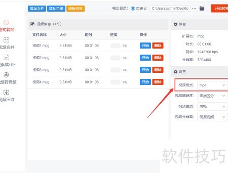 6、 在右侧的格式下拉菜单中选择所需格式,本次需转换为mp4,因此从选项中选取mp4即可完成设置。