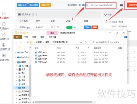 8、 最后需指定输出目录文件夹,用于保存转换完成的MP4文件。所有参数设置完毕后,点击按钮,即可启动格式转换进程。转换完成后,软件将自动弹出输出文件夹窗口,便于用户快速查看和管理已生成的MP4视频文件,操作便捷高效。